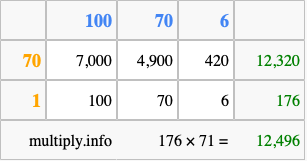 That's all there is to it! As you can see from the box above, the answer to 176 times 71 using the box method is 12,496.