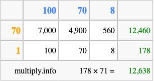 That's all there is to it! As you can see from the box above, the answer to 178 times 71 using the box method is 12,638.