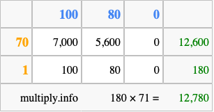 That's all there is to it! As you can see from the box above, the answer to 180 times 71 using the box method is 12,780.