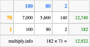 Finally, we add up all the sums we found in step 3 to get our final answer to 182 times 71.