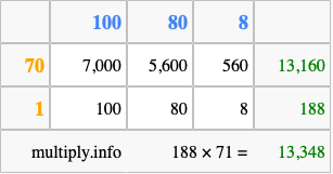 That's all there is to it! As you can see from the box above, the answer to 188 times 71 using the box method is 13,348.