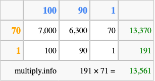 That's all there is to it! As you can see from the box above, the answer to 191 times 71 using the box method is 13,561.