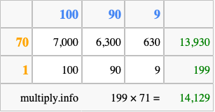 That's all there is to it! As you can see from the box above, the answer to 199 times 71 using the box method is 14,129.