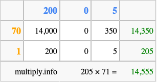 Finally, we add up all the sums we found in step 3 to get our final answer to 205 times 71.