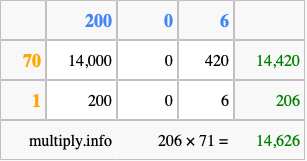 Finally, we add up all the sums we found in step 3 to get our final answer to 206 times 71.