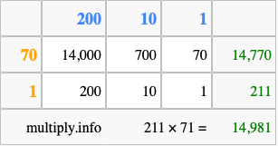 That's all there is to it! As you can see from the box above, the answer to 211 times 71 using the box method is 14,981.