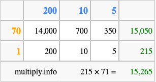Below is an illustration showing you how to calculate 215 times 71 using the box method, using the instructions above.