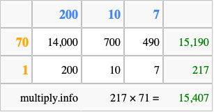 Below is an illustration showing you how to calculate 217 times 71 using the box method, using the instructions above.