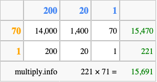 That's all there is to it! As you can see from the box above, the answer to 221 times 71 using the box method is 15,691.