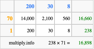 Finally, we add up all the sums we found in step 3 to get our final answer to 238 times 71.