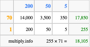 That's all there is to it! As you can see from the box above, the answer to 255 times 71 using the box method is 18,105.