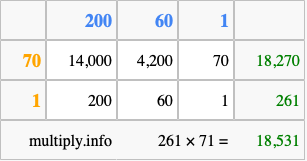 That's all there is to it! As you can see from the box above, the answer to 261 times 71 using the box method is 18,531.