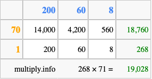 That's all there is to it! As you can see from the box above, the answer to 268 times 71 using the box method is 19,028.
