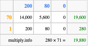 That's all there is to it! As you can see from the box above, the answer to 280 times 71 using the box method is 19,880.
