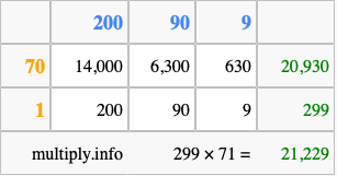 That's all there is to it! As you can see from the box above, the answer to 299 times 71 using the box method is 21,229.