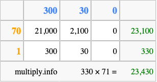 Below is an illustration showing you how to calculate 330 times 71 using the box method, using the instructions above.