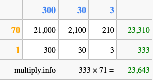 Finally, we add up all the sums we found in step 3 to get our final answer to 333 times 71.