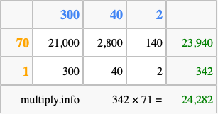 Finally, we add up all the sums we found in step 3 to get our final answer to 342 times 71.
