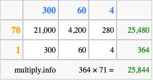 Finally, we add up all the sums we found in step 3 to get our final answer to 364 times 71.