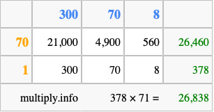 Finally, we add up all the sums we found in step 3 to get our final answer to 378 times 71.