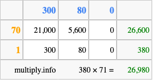 Finally, we add up all the sums we found in step 3 to get our final answer to 380 times 71.