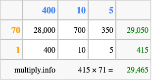 That's all there is to it! As you can see from the box above, the answer to 415 times 71 using the box method is 29,465.