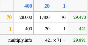 Finally, we add up all the sums we found in step 3 to get our final answer to 421 times 71.
