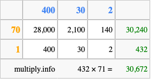 Finally, we add up all the sums we found in step 3 to get our final answer to 432 times 71.