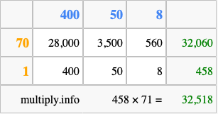 Finally, we add up all the sums we found in step 3 to get our final answer to 458 times 71.