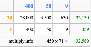 Finally, we add up all the sums we found in step 3 to get our final answer to 459 times 71.
