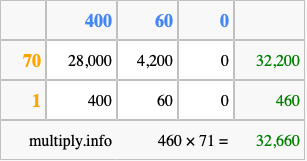 Finally, we add up all the sums we found in step 3 to get our final answer to 460 times 71.