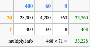 Finally, we add up all the sums we found in step 3 to get our final answer to 468 times 71.