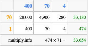 That's all there is to it! As you can see from the box above, the answer to 474 times 71 using the box method is 33,654.