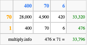 That's all there is to it! As you can see from the box above, the answer to 476 times 71 using the box method is 33,796.
