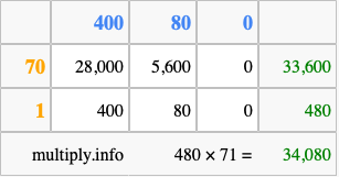 That's all there is to it! As you can see from the box above, the answer to 480 times 71 using the box method is 34,080.