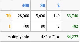 That's all there is to it! As you can see from the box above, the answer to 482 times 71 using the box method is 34,222.