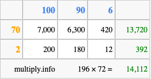 Below is an illustration showing you how to calculate 196 times 72 using the box method, using the instructions above.