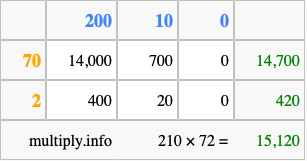That's all there is to it! As you can see from the box above, the answer to 210 times 72 using the box method is 15,120.