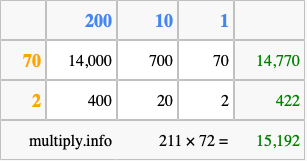 That's all there is to it! As you can see from the box above, the answer to 211 times 72 using the box method is 15,192.
