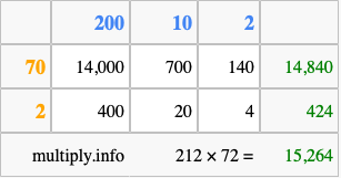 That's all there is to it! As you can see from the box above, the answer to 212 times 72 using the box method is 15,264.