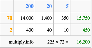 Finally, we add up all the sums we found in step 3 to get our final answer to 225 times 72.