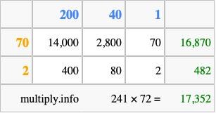 That's all there is to it! As you can see from the box above, the answer to 241 times 72 using the box method is 17,352.