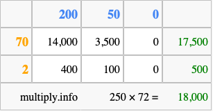 Below is an illustration showing you how to calculate 250 times 72 using the box method, using the instructions above.