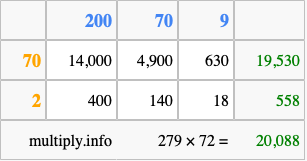 That's all there is to it! As you can see from the box above, the answer to 279 times 72 using the box method is 20,088.