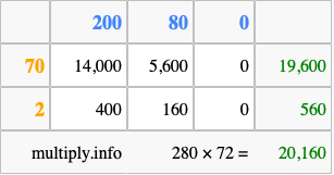 That's all there is to it! As you can see from the box above, the answer to 280 times 72 using the box method is 20,160.