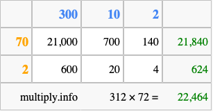 Finally, we add up all the sums we found in step 3 to get our final answer to 312 times 72.
