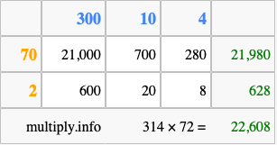 That's all there is to it! As you can see from the box above, the answer to 314 times 72 using the box method is 22,608.