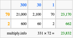 That's all there is to it! As you can see from the box above, the answer to 331 times 72 using the box method is 23,832.