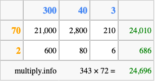 That's all there is to it! As you can see from the box above, the answer to 343 times 72 using the box method is 24,696.