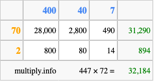 That's all there is to it! As you can see from the box above, the answer to 447 times 72 using the box method is 32,184.